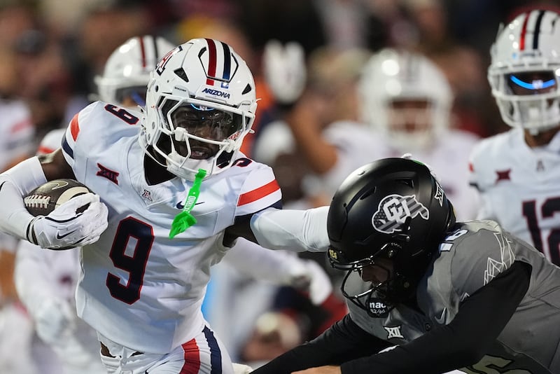 Colorado quarterback Ryan Staub (16) tackles Arizona defensive back Ayden Garnes (9) after his pass interception during game Saturday, Nov. 1, 2025, in Boulder, Colo. | David Zalubowski, Associated Press 9. Arizona Wildcats (5-3, 2-3 Big 12)