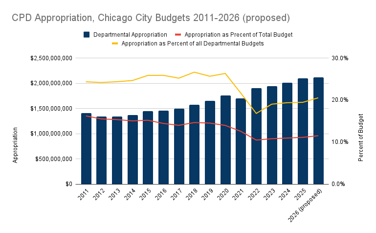 CPD appropriations make up 20.5% of all departmental budgets in the 2026 proposal. Looking at non-grant funds only, CPD makes up 31.4% of locally-funded departmental appropriations, and 50.5% of corporate funded departmental appropriations.