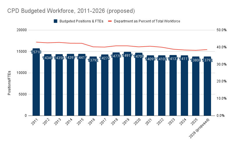 CPD positions make up 38.6% of the city’s total budgeted headcount in the 2026 budget proposal. The next-largest department, the Chicago Fire Department, is roughly one-third the size of CPD, with all other departments considerably smaller.