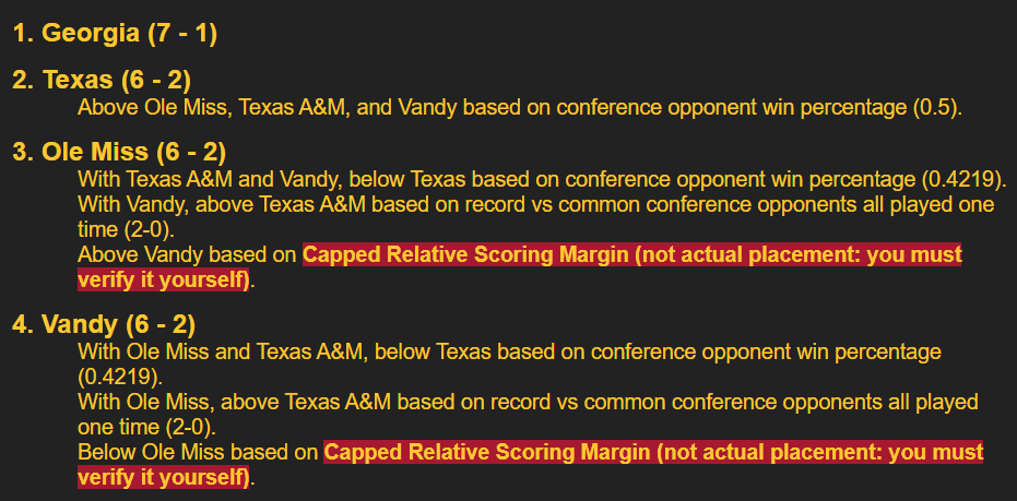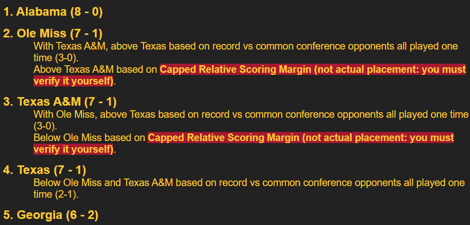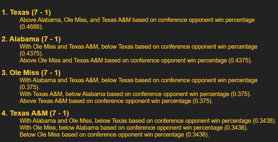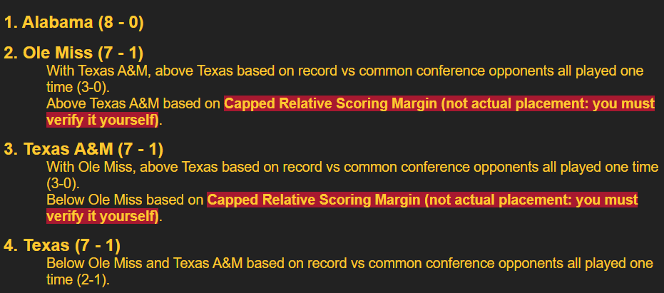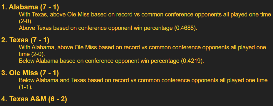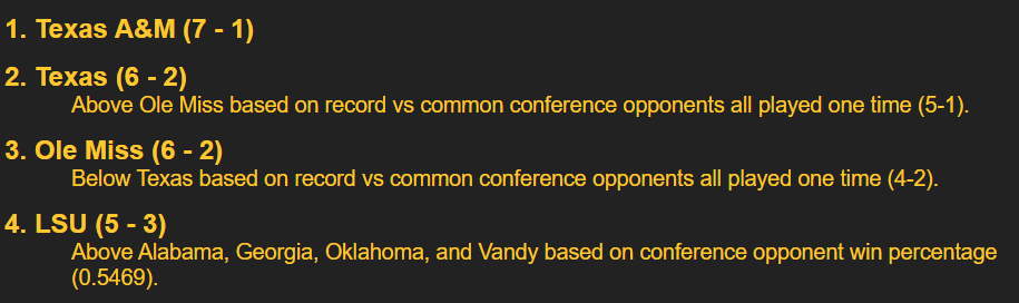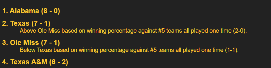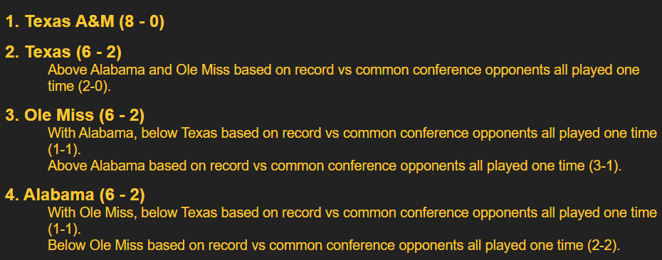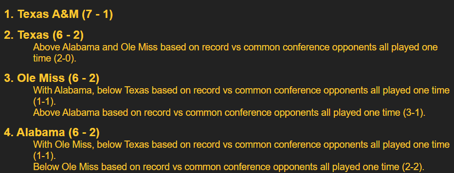 Because of the variance in number of games played (some teams have played six SEC games, some have only played five, and Missouri has only played four), this is a process that will become clearer over the coming weeks. Texas gets to sit at home and watch some of the chaos sort itself out this weekend while on bye.
