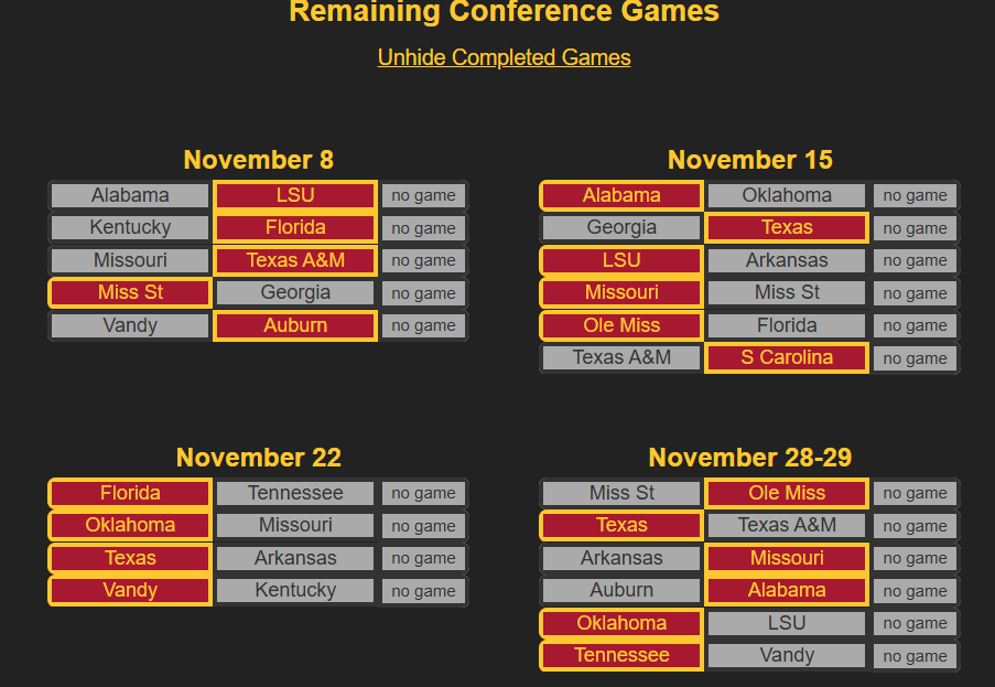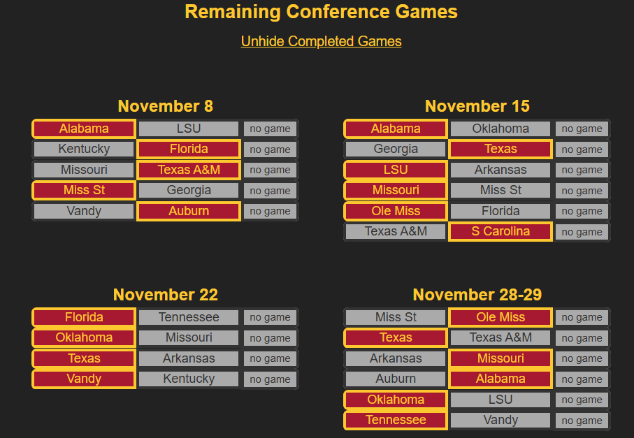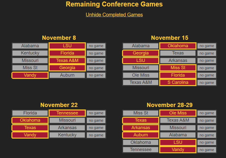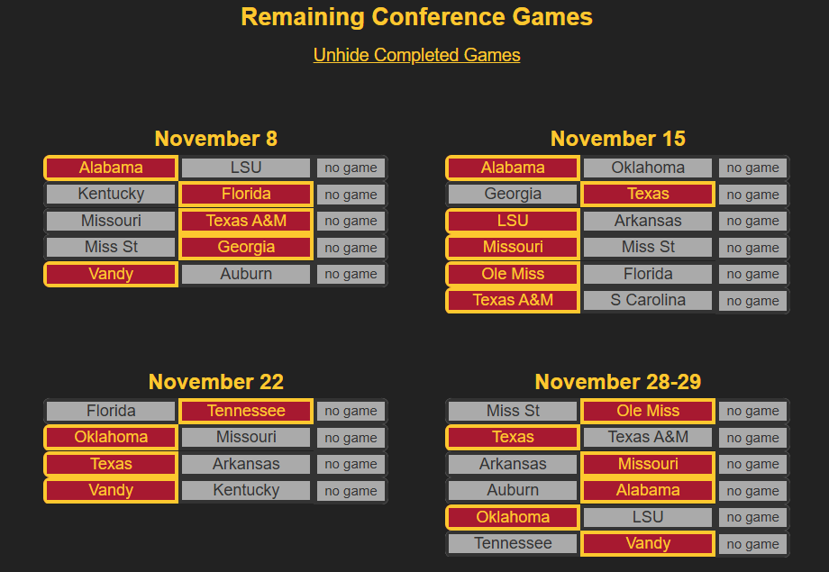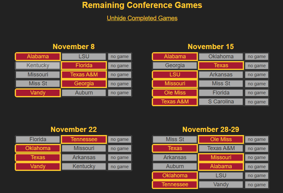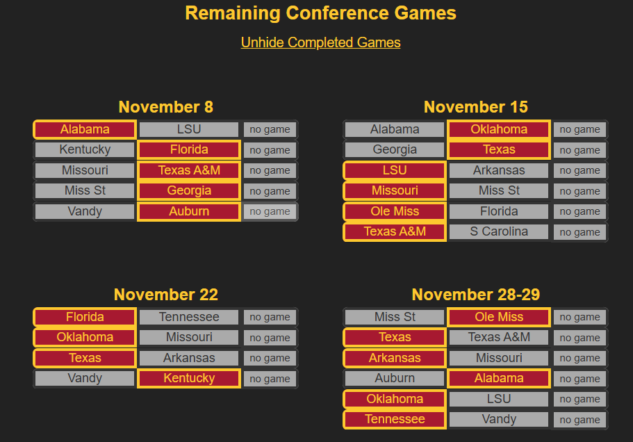 Because of the variance in number of games played (some teams have played six SEC games, some have only played five, and Missouri has only played four), this is a process that will become clearer over the coming weeks. Texas gets to sit at home and watch some of the chaos sort itself out this weekend while on bye.