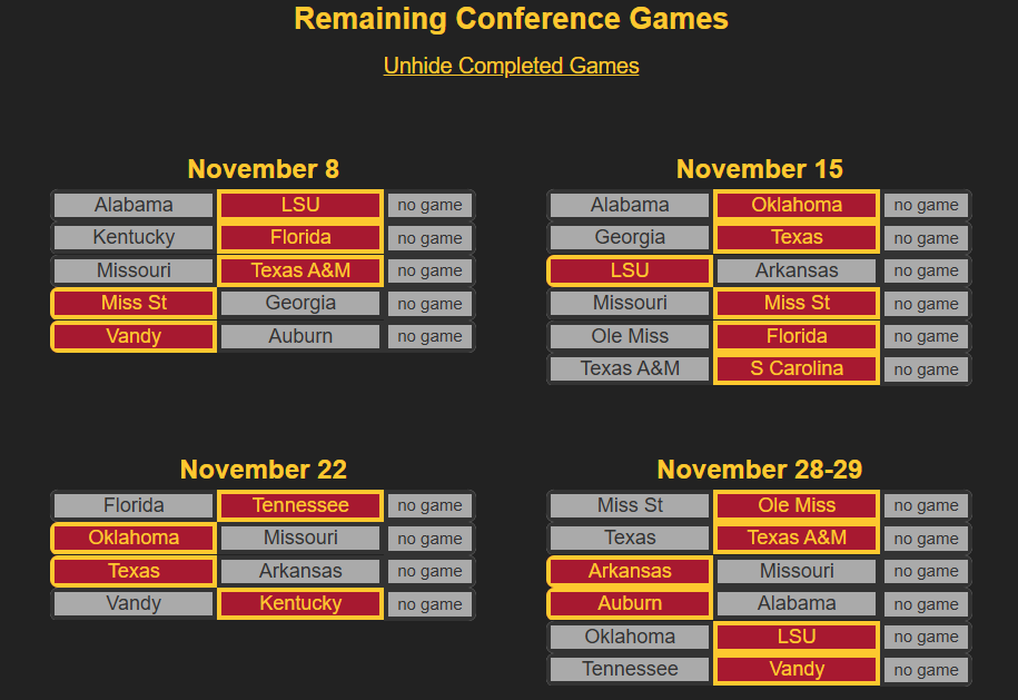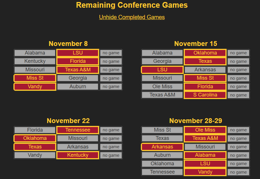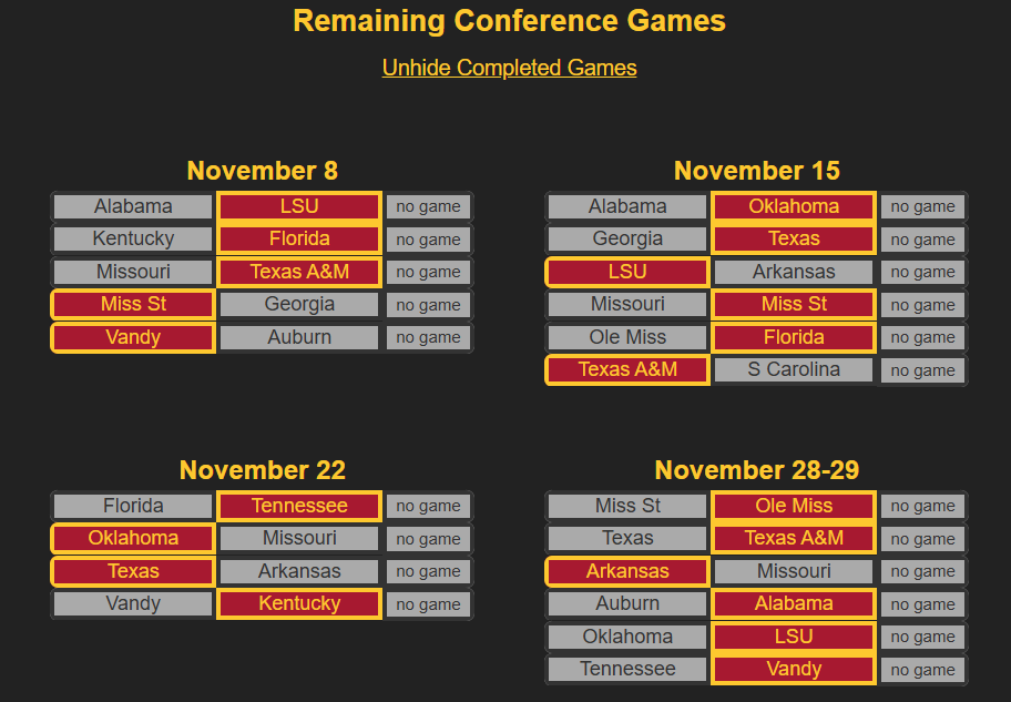 - Missouri: Texas A&M, Mississippi State, at Oklahoma, at Arkansas
