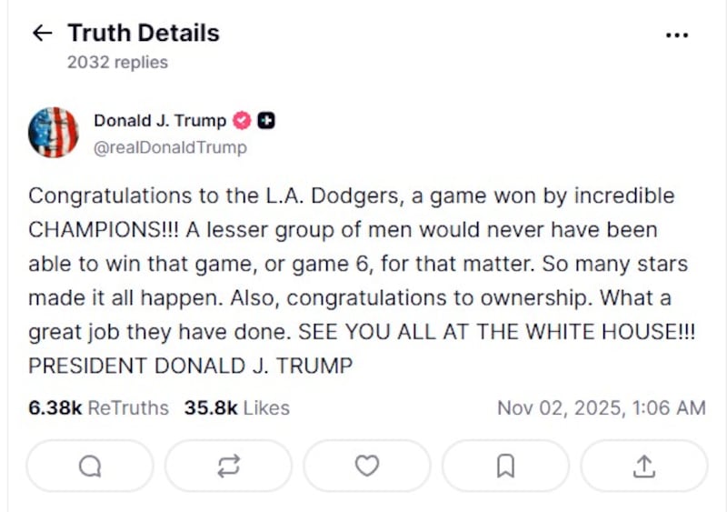 U.S. President Donald Trump congratulated the Dodgers shortly after the Game 7 win and said a “lesser group of men would never have been able to win that game.”
