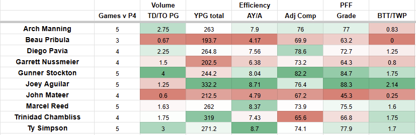 Manning is top-four in most stats here. What really hurts him is that Big Time Throw over Turnover Worthy Play stat. The problem is that he suffered most of those turnover-worthy throw stats against Florida. Does Manning feel turnover-prone after the last four games? No, he’s actually at a 3-1 ratio since UF. He would be first on this list.