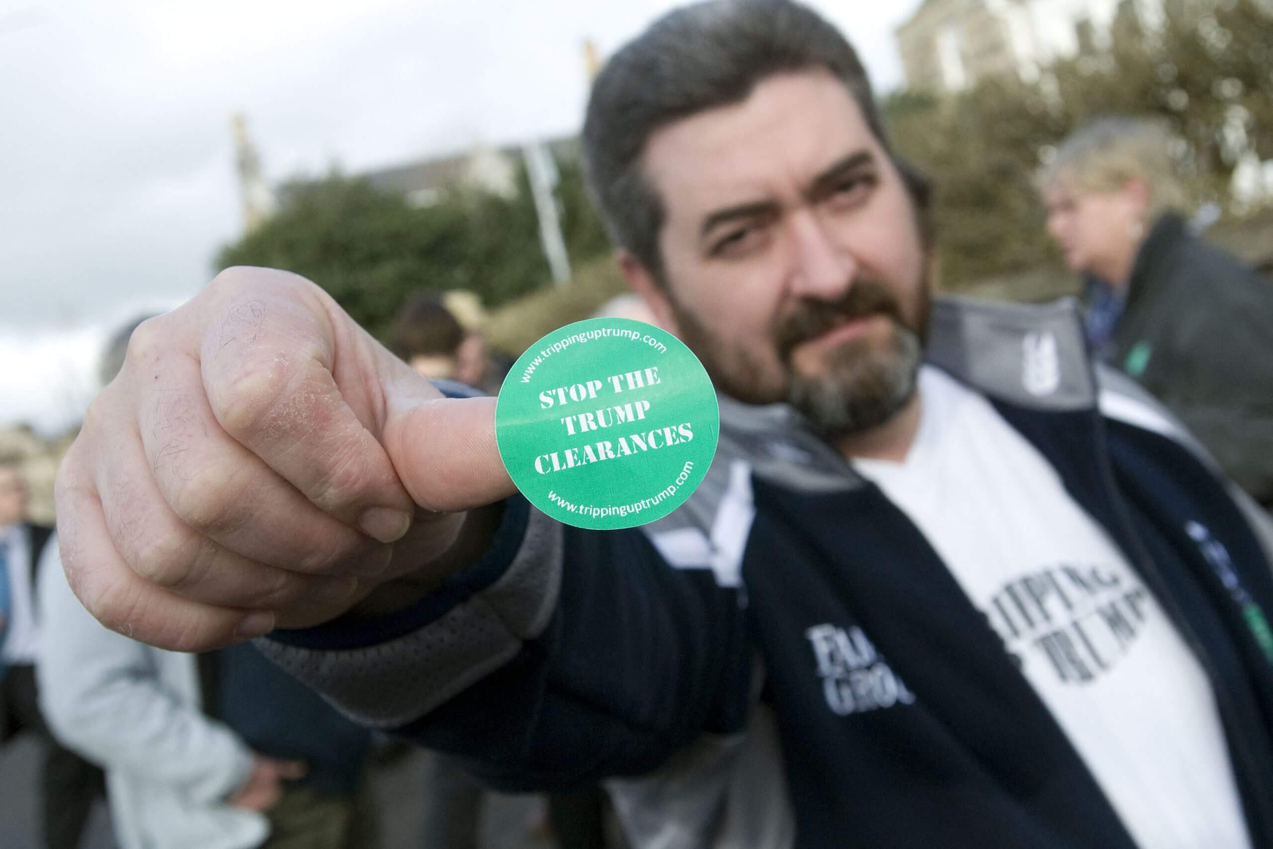 Homeowner David Milne holds up a ‘Stop The Trump Clearances’ sticker in protest at plans to build a course in Aberdeen (Derek Blair / AFP via Getty Images)