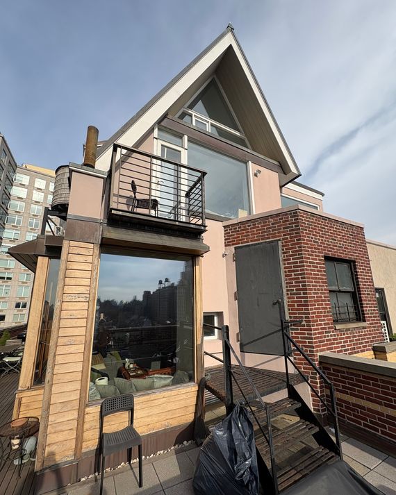 By 1995, Tesoro was ready to knock down some walls. The co-op board had already given its blessing to the rough sketches he’d made of the penthouse (a large two-story box that, he says, was meant to showcase “an attitude about light and structure and spacemaking”). But by the time he had saved up enough cash to start, the Department of Buildings had stepped in with concerns. The penthouse was less than 30 feet from the property line, so the city wouldn’t let him expand the walls out any further. What he could do, though, was build an A-frame triplex with a sloped roof that stretched out past the first floor. “Legally, a roof can overhang in a backyard,” he says. After “many rounds of pleading,” city officials signed off. The penthouse would be three stories with dormers on the south side, a trio of bedrooms on the second floor, and a svelter third-floor attic. “I had to figure out something clever,” he tells me. “That’s how it ended up being a chalet.”