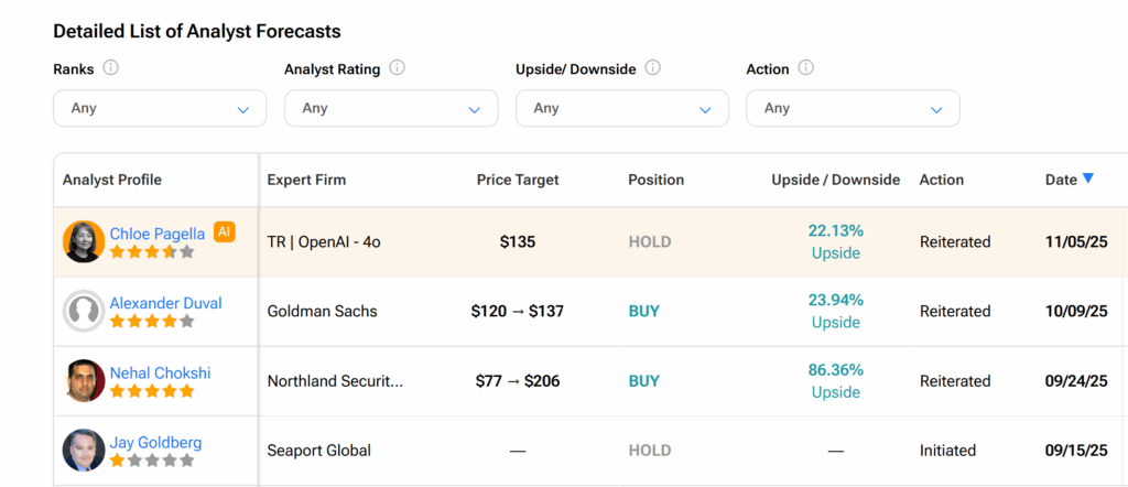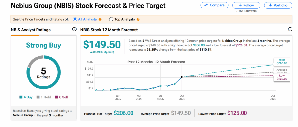 On Wall Street, Nebius’s shares currently hold a Strong Buy consensus rating based on four Buys and one Hold issued by analysts over the past three months. Moreover, the average NBIS price target of $149.50 indicates about a 35% upswing from the current level.