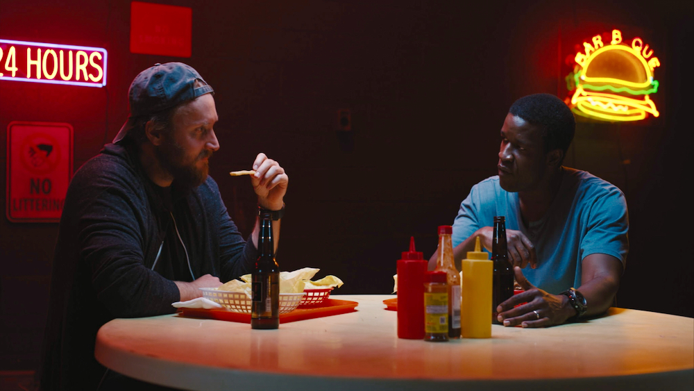 A scene from “American Solitaire” with Joshua Close as Slinger and Gilbert Owuor as Auggie. Photo courtesy of Aaron Davidman.