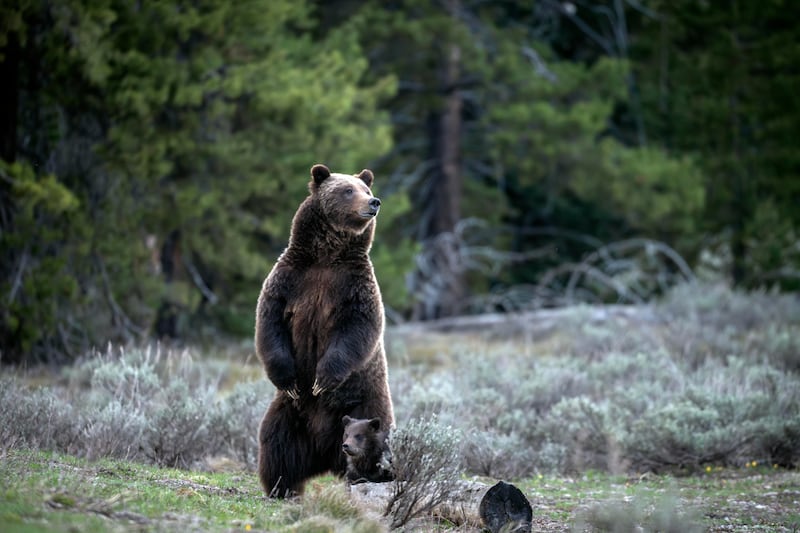 In this undated photo provided by Grand Teton National Park a grizzly bear known as No. 399 stands along side a cub. | C. Adams, Grand Teton National Park via AP