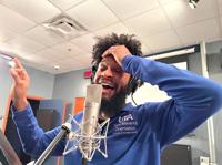 Jeremiah Cleaver, UTA Records president and music industry studies senior, sings into a microphone inside a studio.