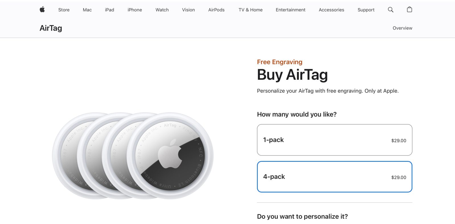 Anyways, as it stands right now, you can get a single AirTag from Apple for $29 … or a 4-pack for $29. The mistake only appears to be applicable in the United States. If you add engravings, the price jumps back to $99.