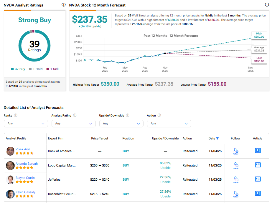 Yes, NVDA stock commands a Strong Buy consensus rating on TipRanks based on 37 Buys, one Hold rating, and one Sell rating. The average Nvidia price target of $237.35 implies 26.2% upside potential from current levels. Year-to-date, NVDA stock has surged 40%.