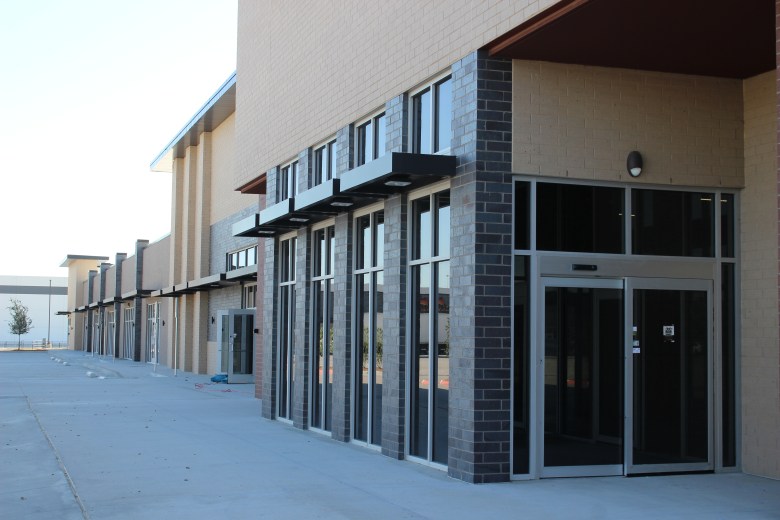 Construction crews have completed the shells of buildings in the H Mart-anchored shopping center at North Beach Street and Loop 820 in Haltom City. H Mart is expected to open in spring 2026. (Scott Nishimura | Fort Worth Report)