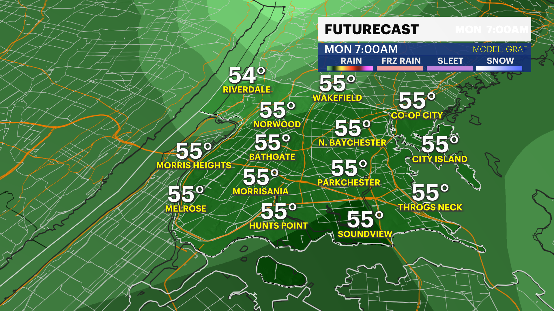 MONDAY: Early rain and clouds, then partly sunny and breezy afternoon. High of 52.