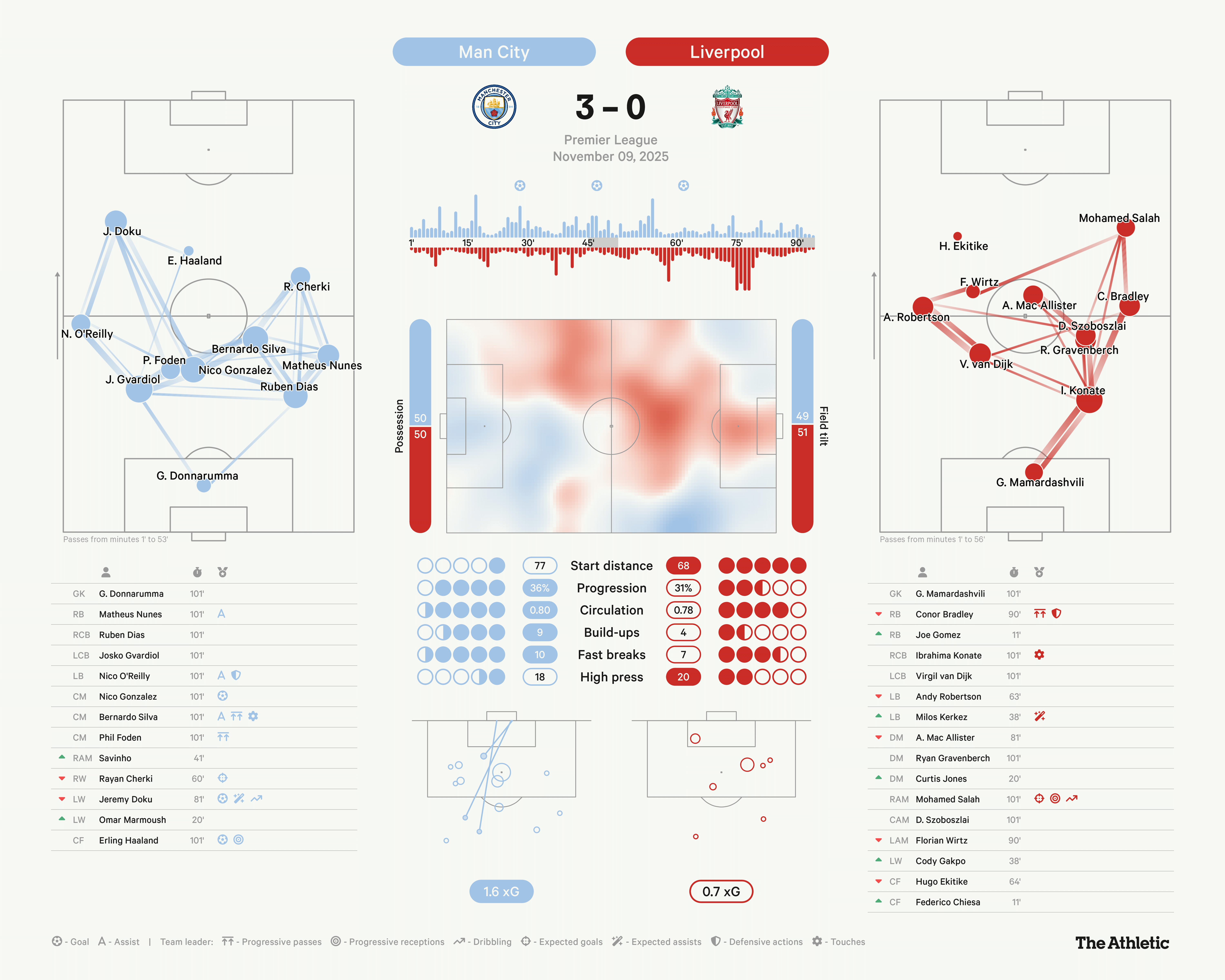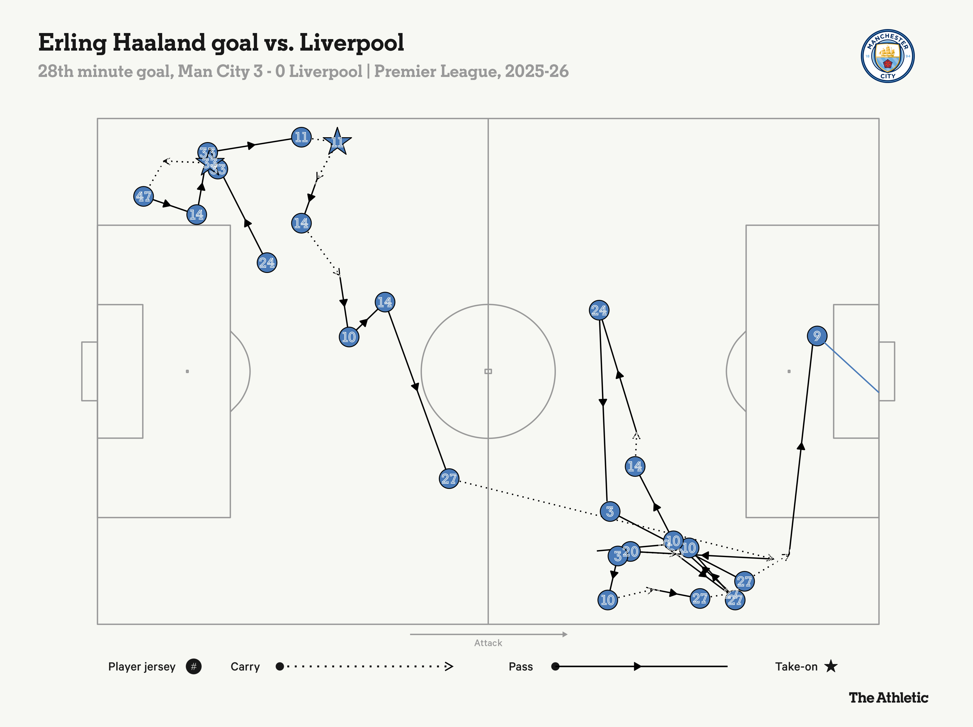 When Haaland headed home the cross from Matheus Nunes, it meant all 10 City outfield players had touched the ball in a length-of-the-pitch move. Twenty passes led to that right-wing delivery, and the passage of play encapsulated how the home side dominated the first half, resisting any pressure Liverpool applied by somehow always having a man spare.