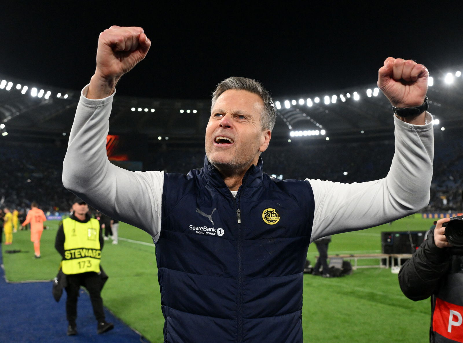 Soccer Football – Europa League – Quarter Final – Second Leg – Lazio v Bodo/Glimt – Stadio Olimpico, Rome, Italy – April 17, 2025 Bodo/Glimt coach Kjetil Knutsen celebrates after winning the penalty shootout REUTERS/Alberto Lingria