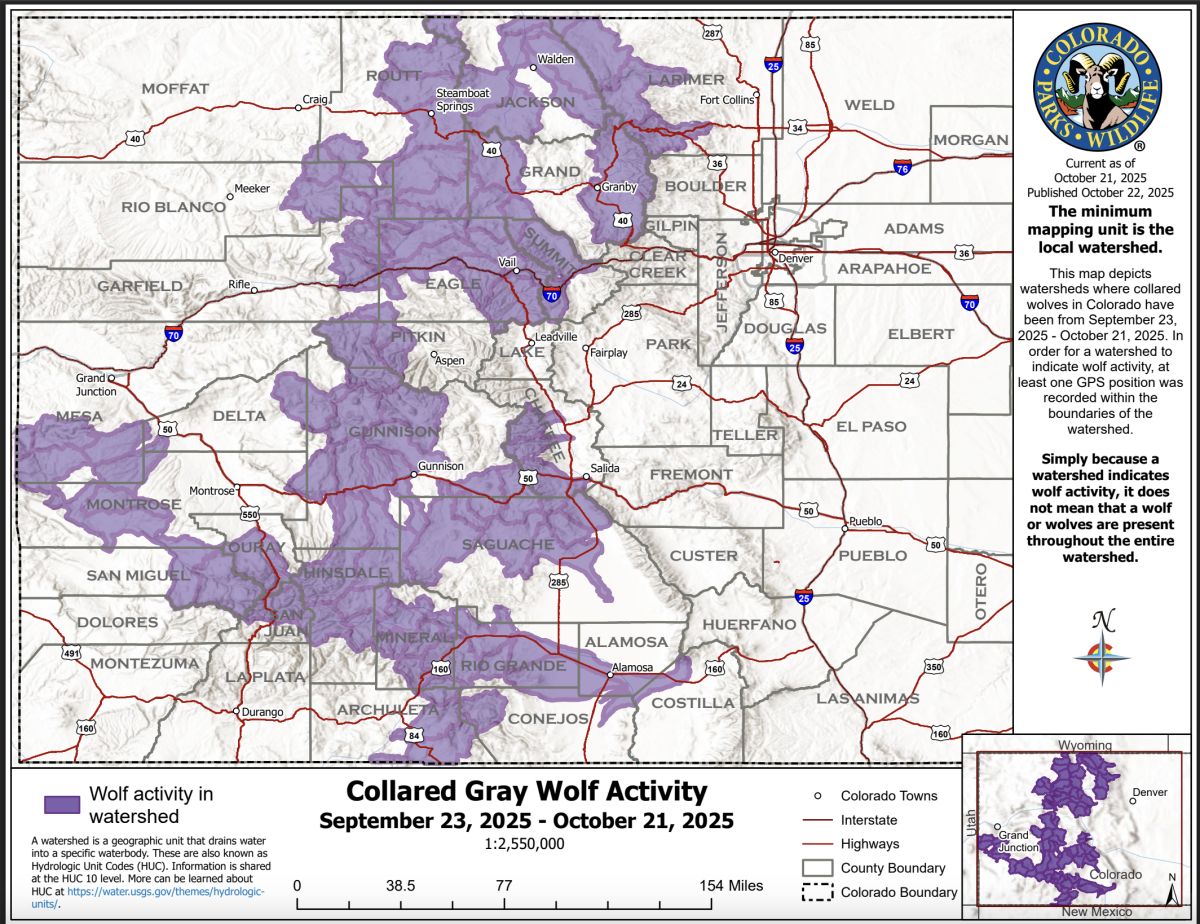 The map above depicts watersheds where wolves in Colorado were Sept. 23-Oct. 21, 2025. Below, it is in use as the Colorado Wolf Track Facebook page cover photo. (Colorado Parks and Wildlife map; Colorado Wolf Tracker Facebook page)
