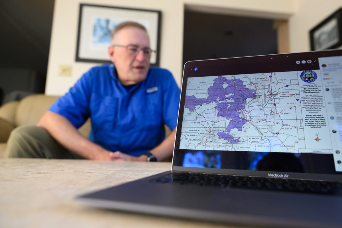 John Michael Williams talks about his Colorado Wolf Tracker Facebook page at his home in Colorado Springs. Williams created the page in 2023 as a place to post reports of wolf sightings and depredations in Colorado. (Mark Reis, Special to The Colorado Sun)