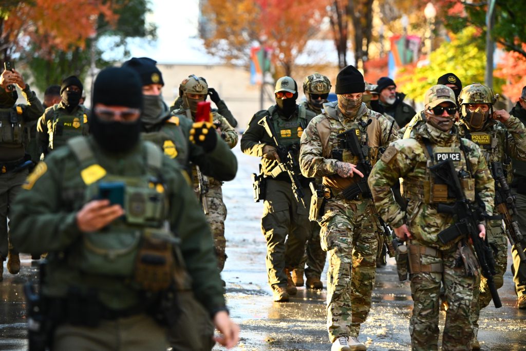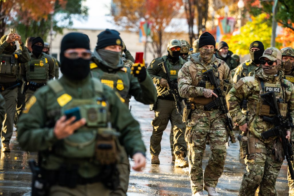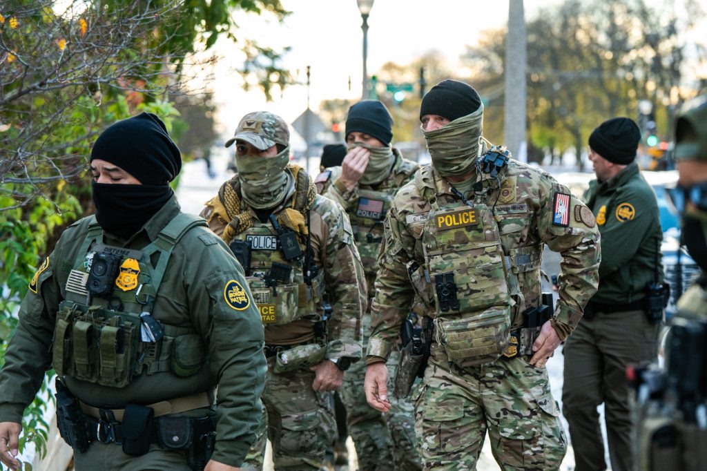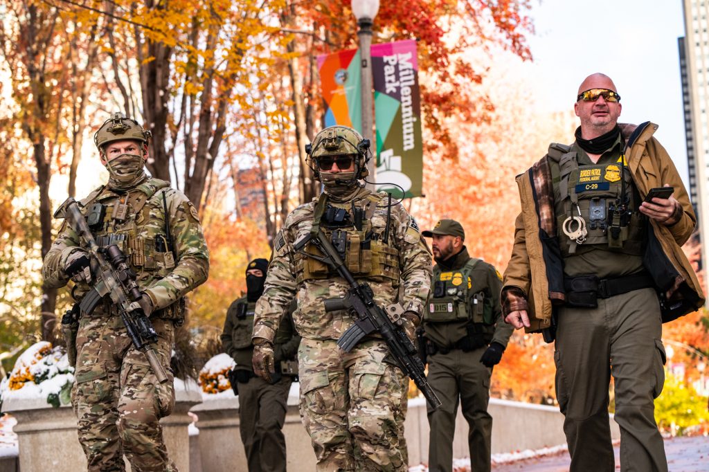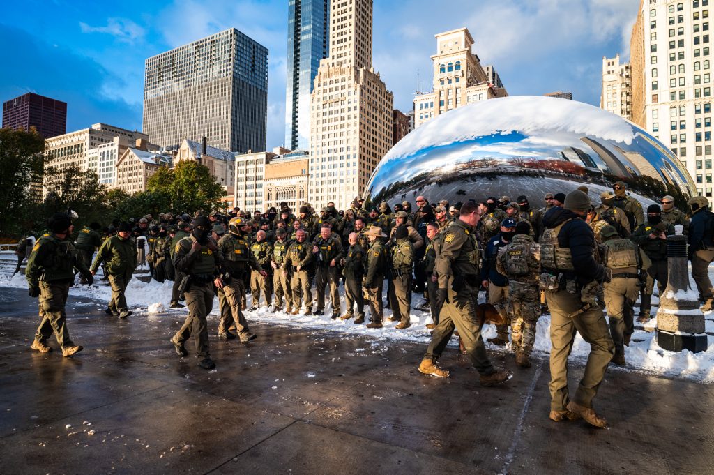 Just before 6:30 a.m., adjacent Monroe Street was filled with undercover SUVs; after 7 a.m., the agents in green fatigues — many with large firearms — poured out and marched to artist Anish Kapoor’s Cloud Gate.