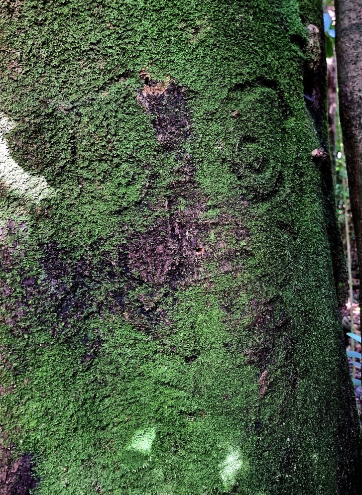 It’s a bit hard to make out, but this is a dendroglyph, markings carved into the bark of a kopi (Corynocarpus laevigatus) tree by the Moriori, who were the original inhabitants of the Chathams. They had one of the world’s only true pacifist societies, and when Maori from New Zealand invaded in 1835 they put up no resistance. Consequently they were massacred, many of them were eaten (Maori were cannibals), and the rest enslaved. Within a century the last full-blooded Moriori was dead, though a few people today still claim Moriori ancestry, descended from slaves and their Maori masters. The dendroglyphs are now at least 190 years old, and very few are left. We found this one, not signposted and not visible from the track, entirely by chance, in a patch of forest where their presence was not known, or at least not publicised: