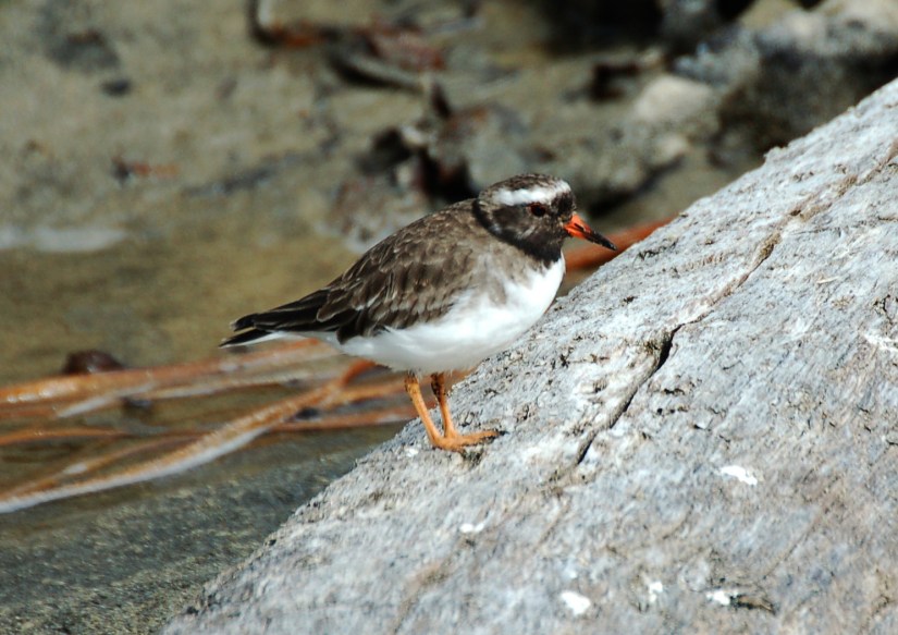 Shore plovers (Charadrius novaeseelandiae) were wiped off the New Zealand mainland by exotic mammalian predators by the 1870s, and for more than a century existed only on Rangatira Island, which lies just off Pitt Island in the Chathams. Small populations have now been re-established on a couple of predator-free islands off the New Zealand mainland, as well as another island in the Chathams group, but the global population is still below 200. Intensive predator control on Pitt (where a few feral cats persist) has recently allowed the odd pair to breed there, which is where we saw this one, along with a recently fledged juvenile: