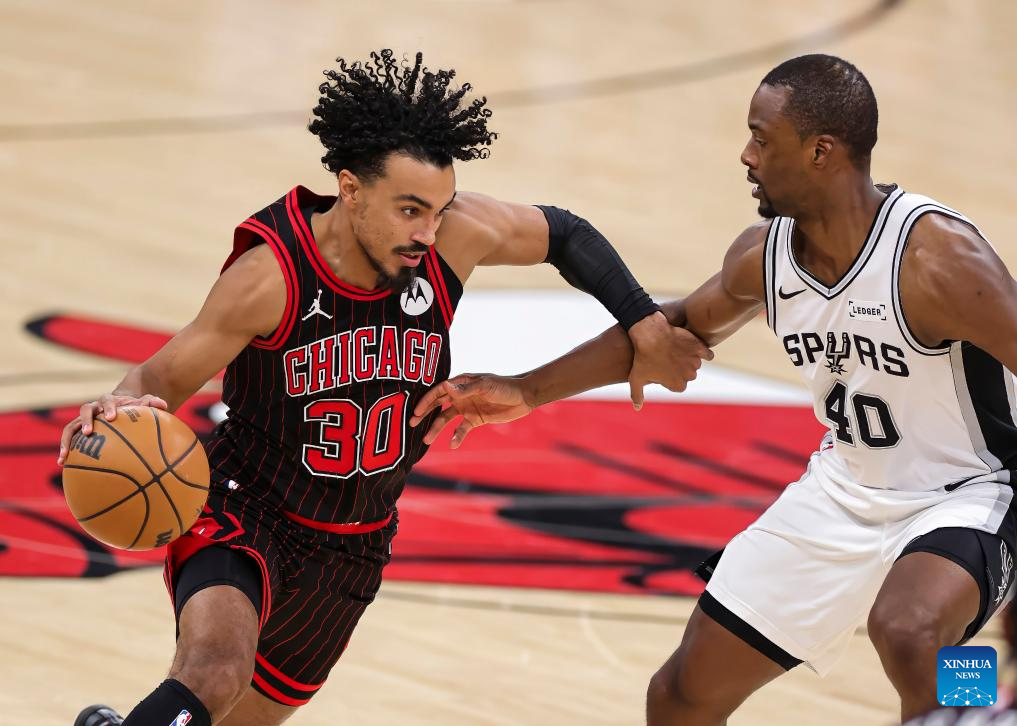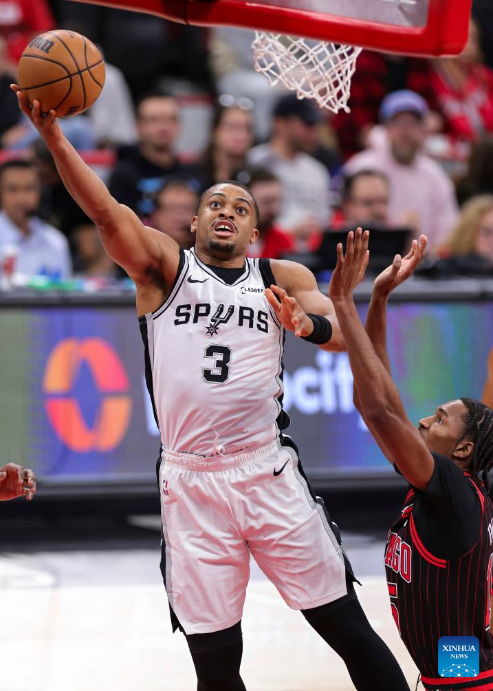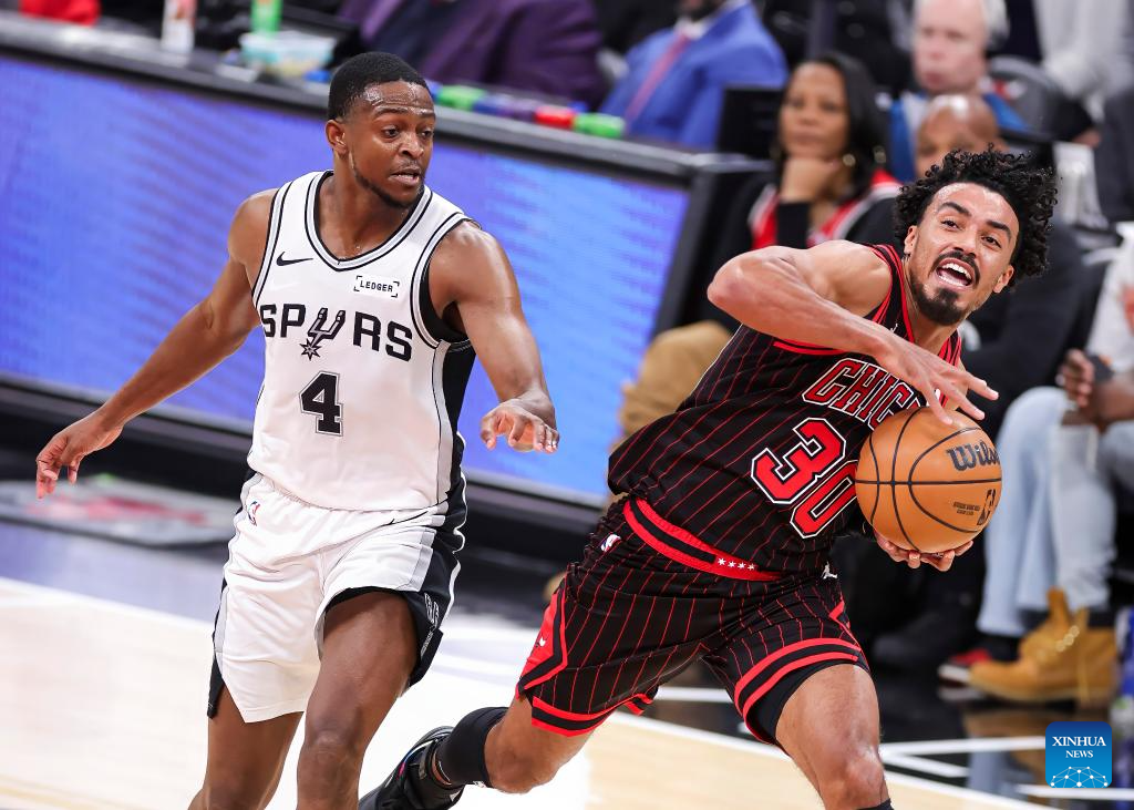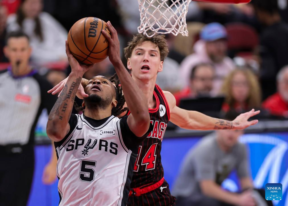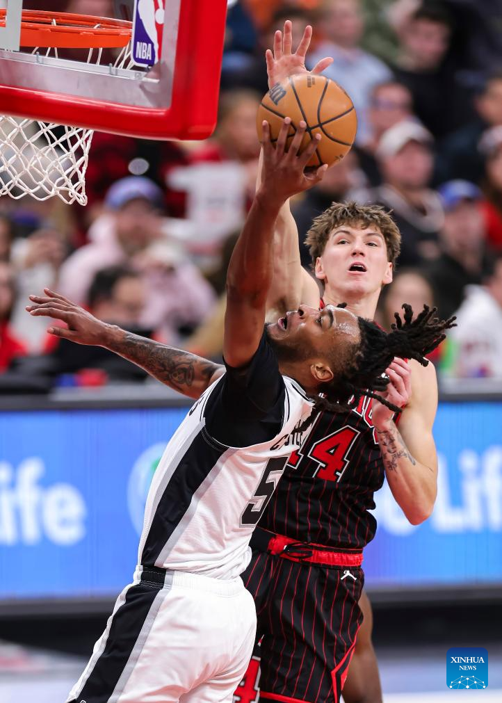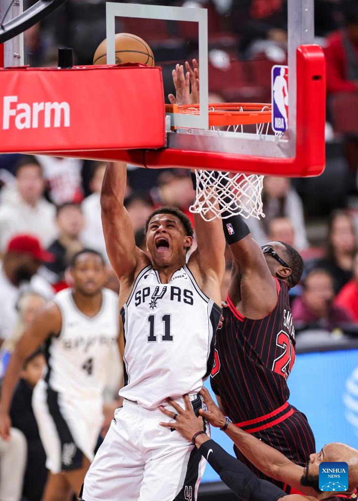 San Antonio Spurs’ Carter Bryant (top L) goes to the bakset during the 2025-2026 NBA regular season match between Chicago Bulls and San Antonio Spurs in Chicago, the United States, on Nov. 10, 2025. (Photo by Joel Lerner/Xinhua)