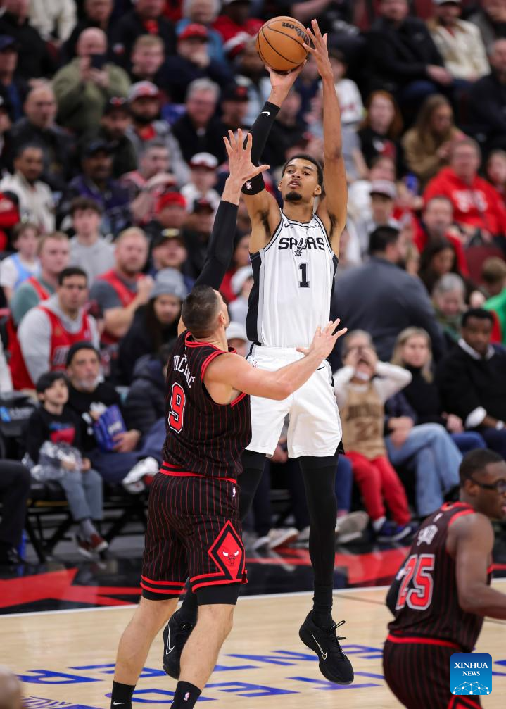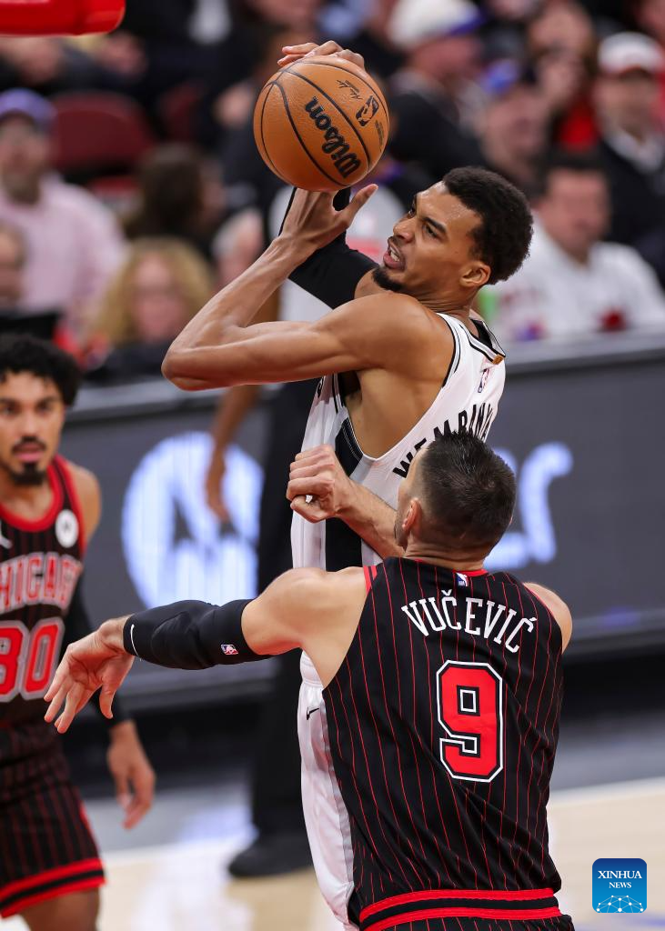 San Antonio Spurs’ Victor Wembanyama (top) competes during the 2025-2026 NBA regular season match between Chicago Bulls and San Antonio Spurs in Chicago, the United States, on Nov. 10, 2025. (Photo by Joel Lerner/Xinhua)