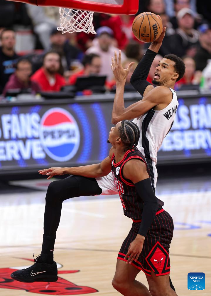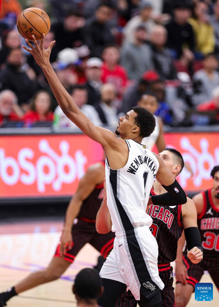 San Antonio Spurs’ Victor Wembanyama (front) goes for a layup during the 2025-2026 NBA regular season match between Chicago Bulls and San Antonio Spurs in Chicago, the United States, on Nov. 10, 2025. (Photo by Joel Lerner/Xinhua)