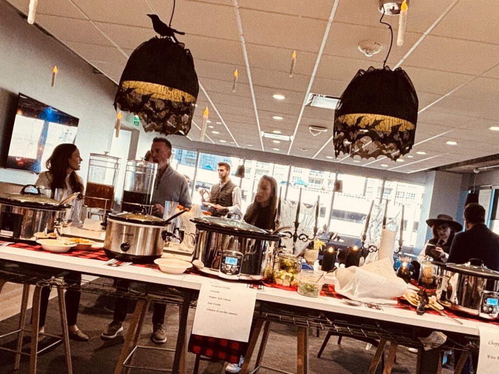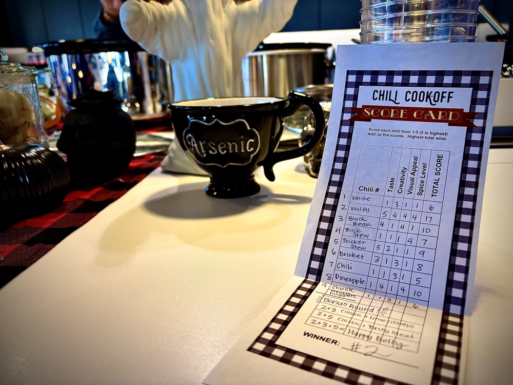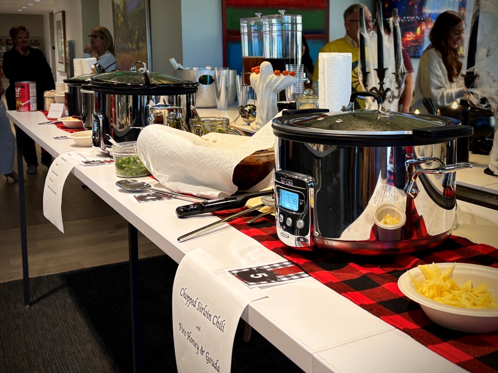 Angela Thornhill, VP of Sales, dressed as Annie Hall, was there to give me the lay of the land as I navigated nine impressive chilis ranging from brisket and white chili to black bean and even pineapple chili. Each entry was judged on Taste, Creativity, Visual Appeal, and Spice Level, with awards for People’s Choice and my own Judge’s Choice. I went a little overboard, creating bonus categories for what chilis would make the best combined chili — and yes, I came prepared with Tupperware, because I wasn’t here to play. My scorecard was serious business; careful time and attention went into every point.