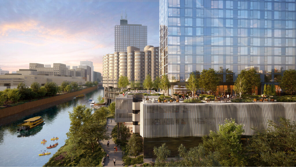 The 28-story tower will contain 330 residential units and will be clad in a multi-tone glass exterior meant to mimic the water’s surface. There will also be a large rooftop deck atop the podium with a pool. The project has officially been approved by the city as part of the larger planned development. The team can now move forward once funding and permits are cleared.