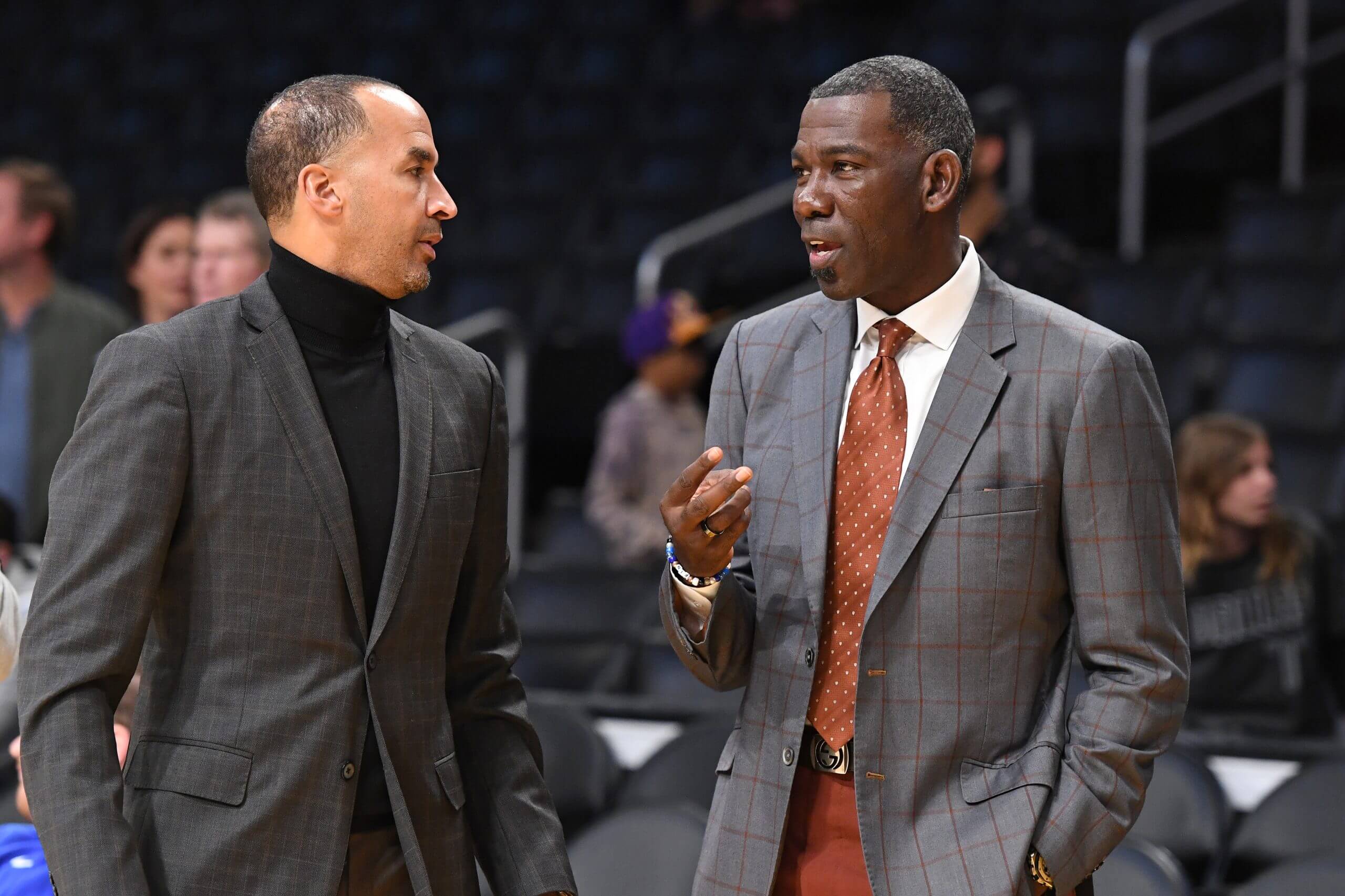 Michael Finley, right, a former All-Star for the Dallas Mavericks, was named co-interim general manager of the team after former GM Nico Harrison, left, was fired. (Andrew D. Bernstein / NBAE via Getty Images)