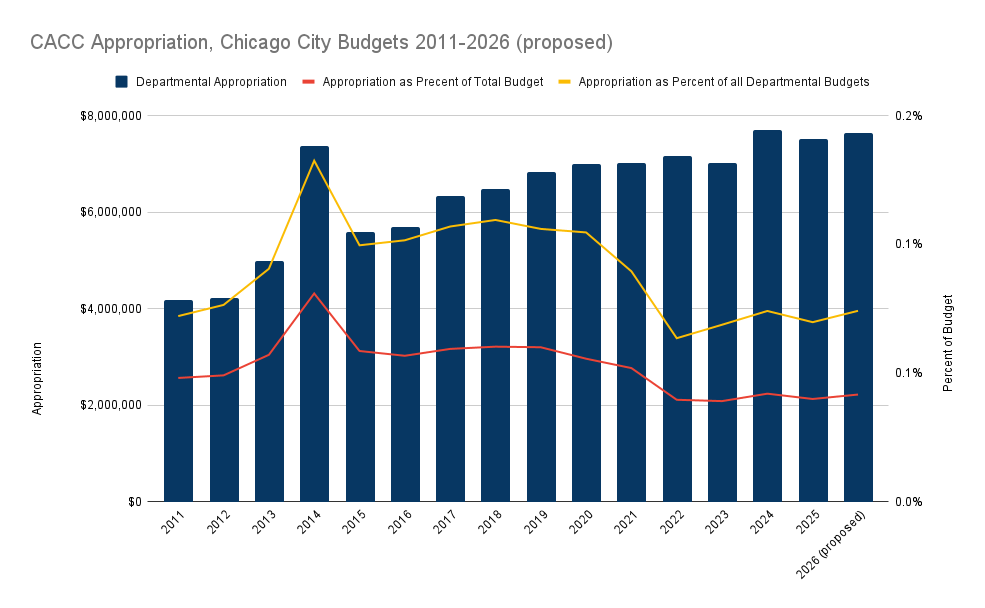From 2011-2025, CACC’s budget grew at an average rate of 5.7%, or 2.9% adjusted for inflation, compared to a citywide average rate of 8.3% (inflation-adjusted 4.4%).