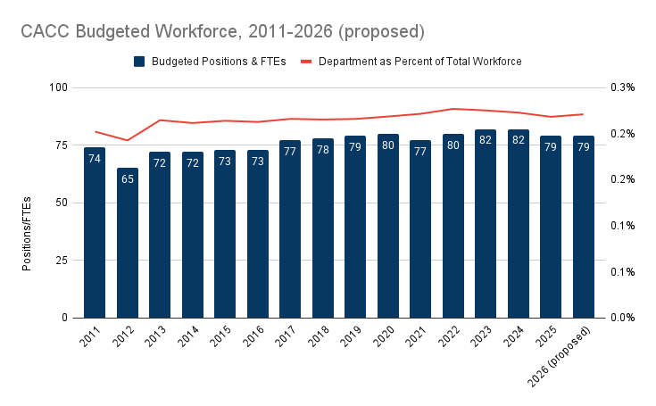CACC’s budgeted headcount has remained relatively stable for more than a decade, with an average rate of change from 2011-2025 of 0.5% annually, compared to a citywide average annual change of -0.1%.