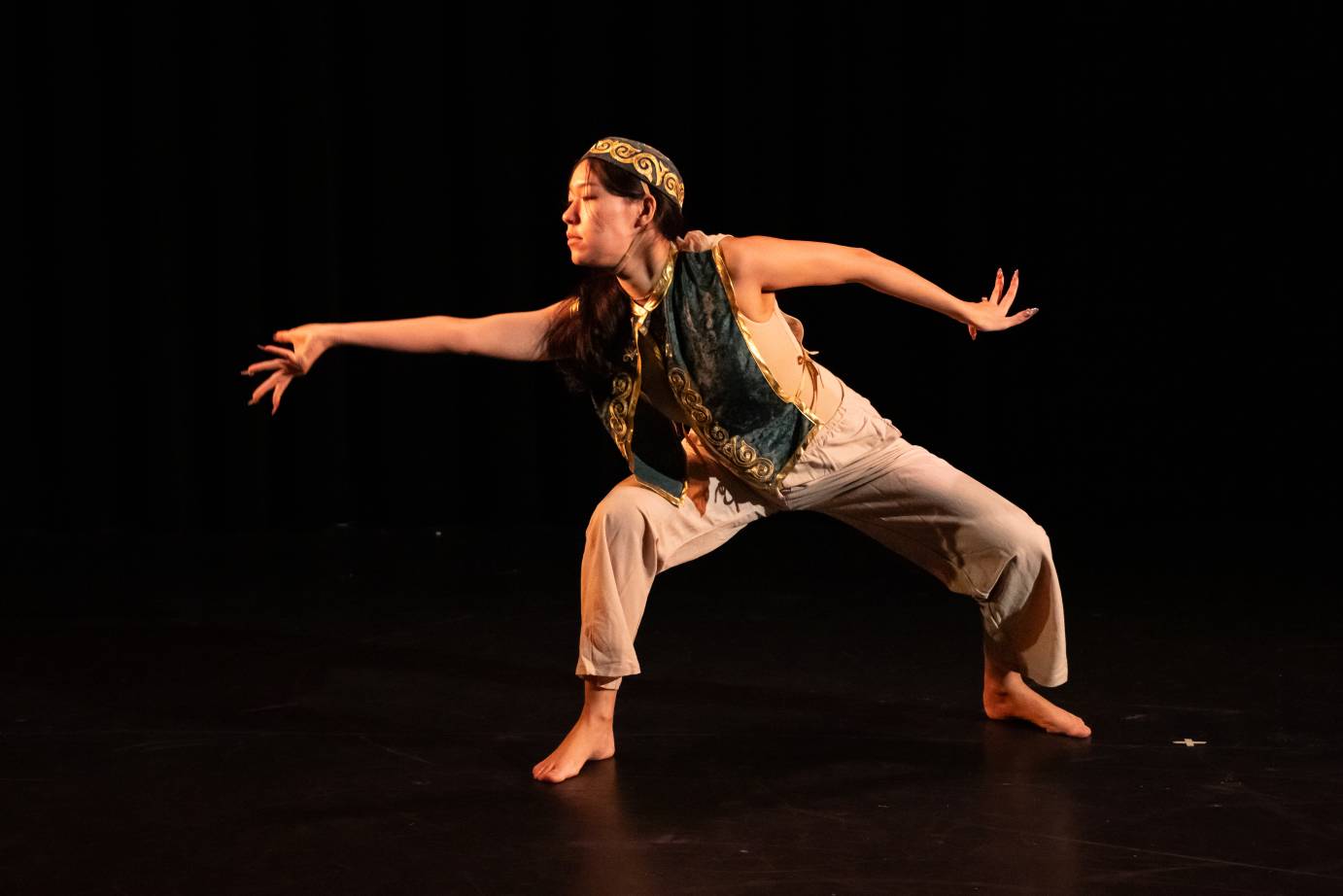 The third work, Cut, a duet choreographed by Davinara Marcario and performed by Marcario and Ava Rakowski, offers grounded, expansive movements showing lines and extension, as well as crawls that undulated across the floor. The dancers never broke focus from one another as they glided through space, emphasizing connection and mutual trust. Caps on their heads were tossed to each other and used to cover faces, hinting at identity shifts or concealed truths. The piece ends with the palm of the duo’s hands beating on their chests, followed by a tender embrace and a final bow — all gestures of loyalty, intimacy, and deep mutual respect.