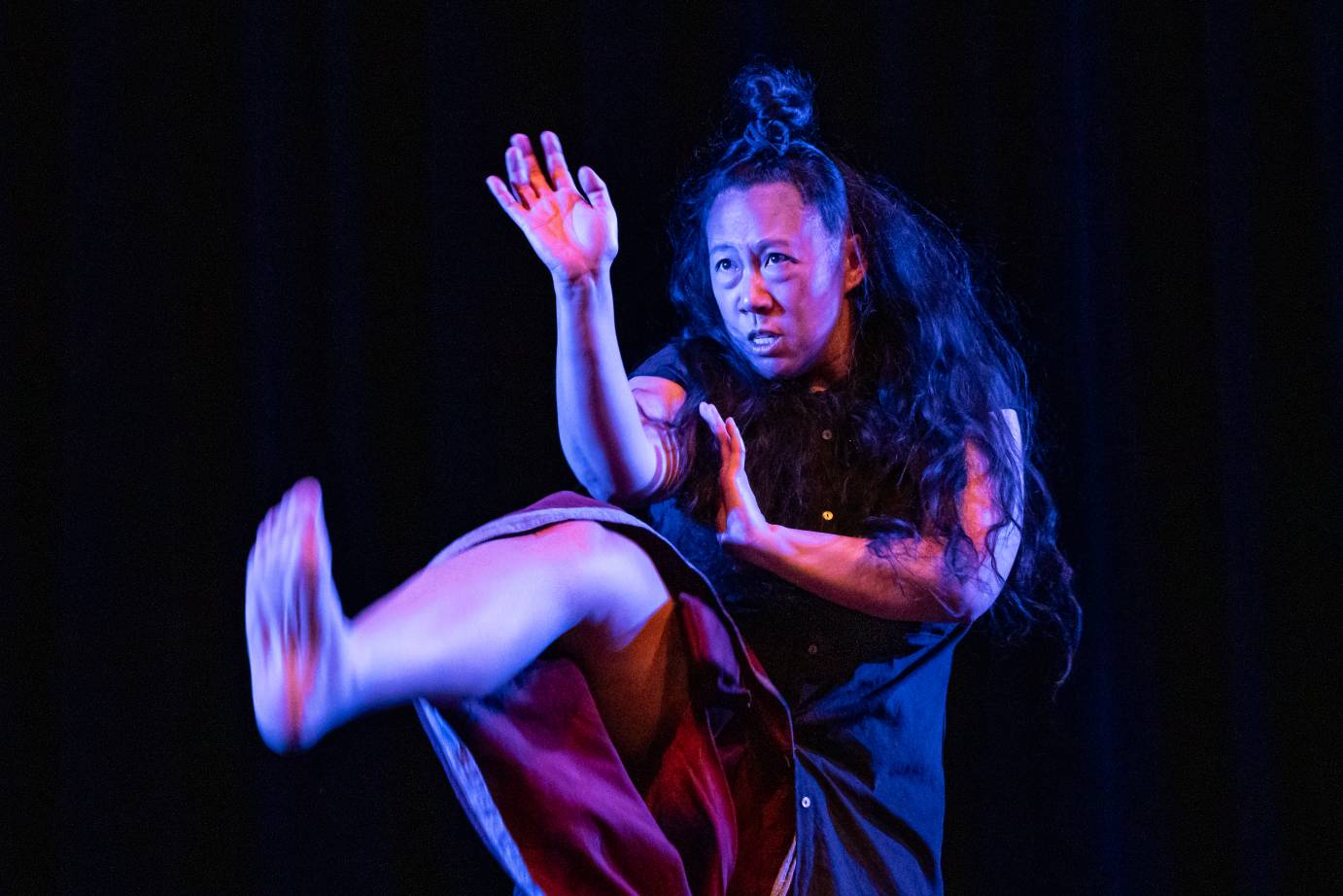 A shift in tone arrived with Hello to Nightmares, Alternate Words & Fictitious Days, choreographed and performed by Yvonne Huatin Chow. Moving between spiritual grace and visceral intensity, Chow’s precise isolations, locks, and undulations seemed to channel unseen forces. Her gaze lifted upward, searching, yet when she fell and struggled to rise, a darker emotional undercurrent emerged—raw, fierce, and haunting. With wide stances, carved arms, and smooth articulate hands, Chow commanded the space, holding the audience spellbound in her dream-like world.