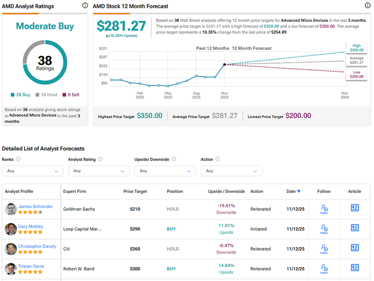 Currently, Wall Street has a Moderate Buy consensus rating on Advanced Micro Devices stock based on 28 Buys and 10 Holds. The average AMD stock price target of $281.27 indicates 10.4% upside potential. AMD stock has rallied 111% year-to-date.