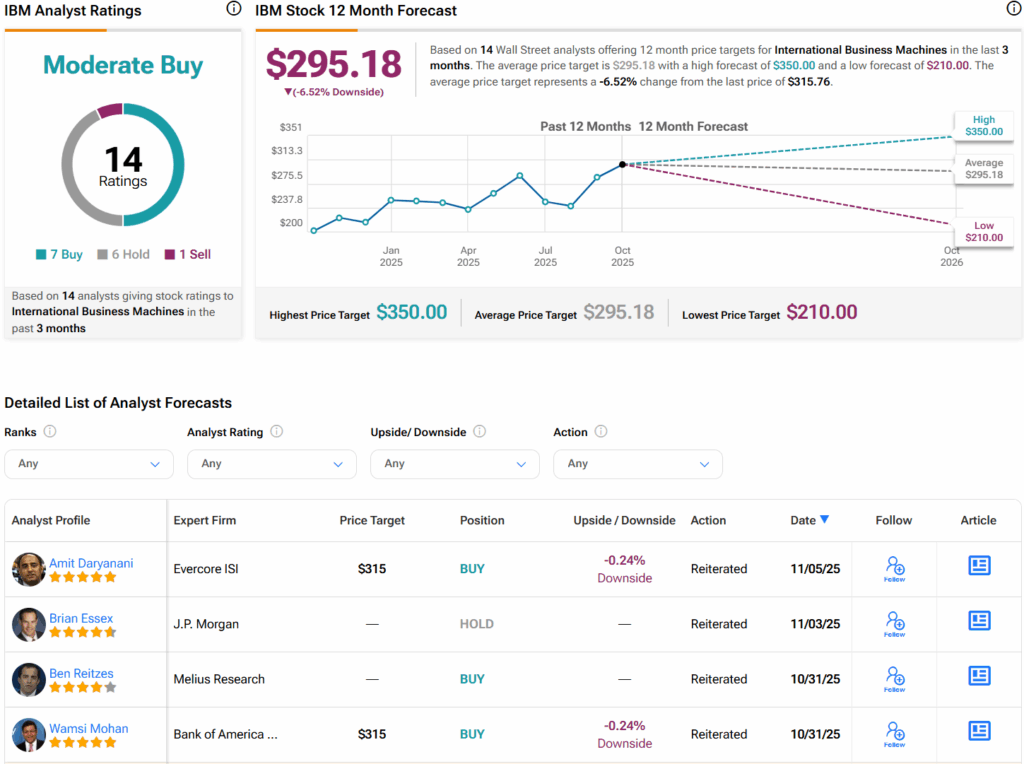 Turning to Wall Street, analysts have a Moderate Buy consensus rating on IBM stock based on seven Buys, six Holds, and one Sell assigned in the past three months, as indicated by the graphic below. Furthermore, the average IBM price target of $295.18 per share implies 6.5% downside risk.