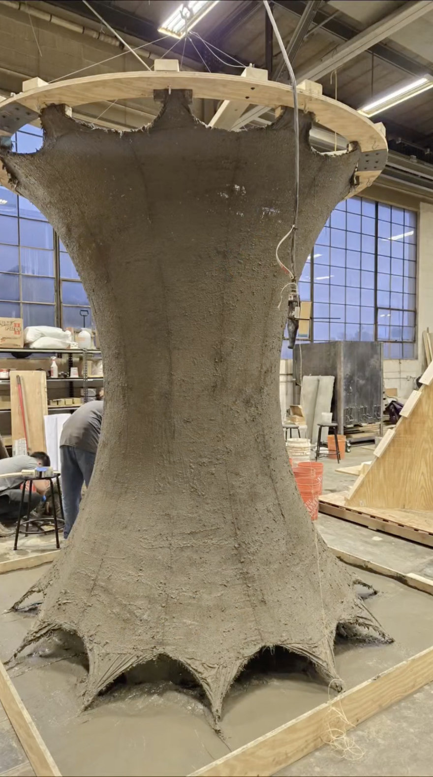 Student Team Group 04 had an unlucky break this week, with their Tensioned Sheet project: They were attempting to cast concrete using a burlap form, hoisting the form upright from a ring as the concrete set. Then disaster struck: