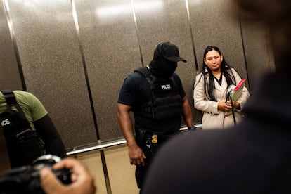On floors 12 and 14, amid hallways with stained white walls and under fluorescent lights that, in the absence of windows, trick the mind and obliterate the sense of time, federal agents patrol daily. Some are in plainclothes, others wear bulletproof vests and are identified as ICE or Customs and Border Protection (CBP) officers. They are armed and almost all have their faces covered, with ski masks that only reveal their eyes.