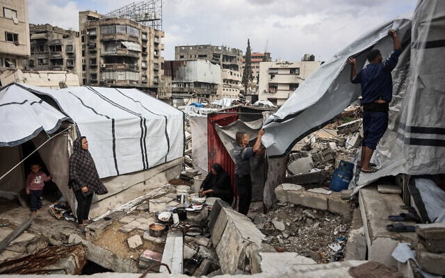 As cloudy skies Friday threatened another downpour in Gaza City, Abdel Rahim Halawa, a father of seven children, worked to fasten a tarp over his tent made of wood, blankets and sheets of plastic.