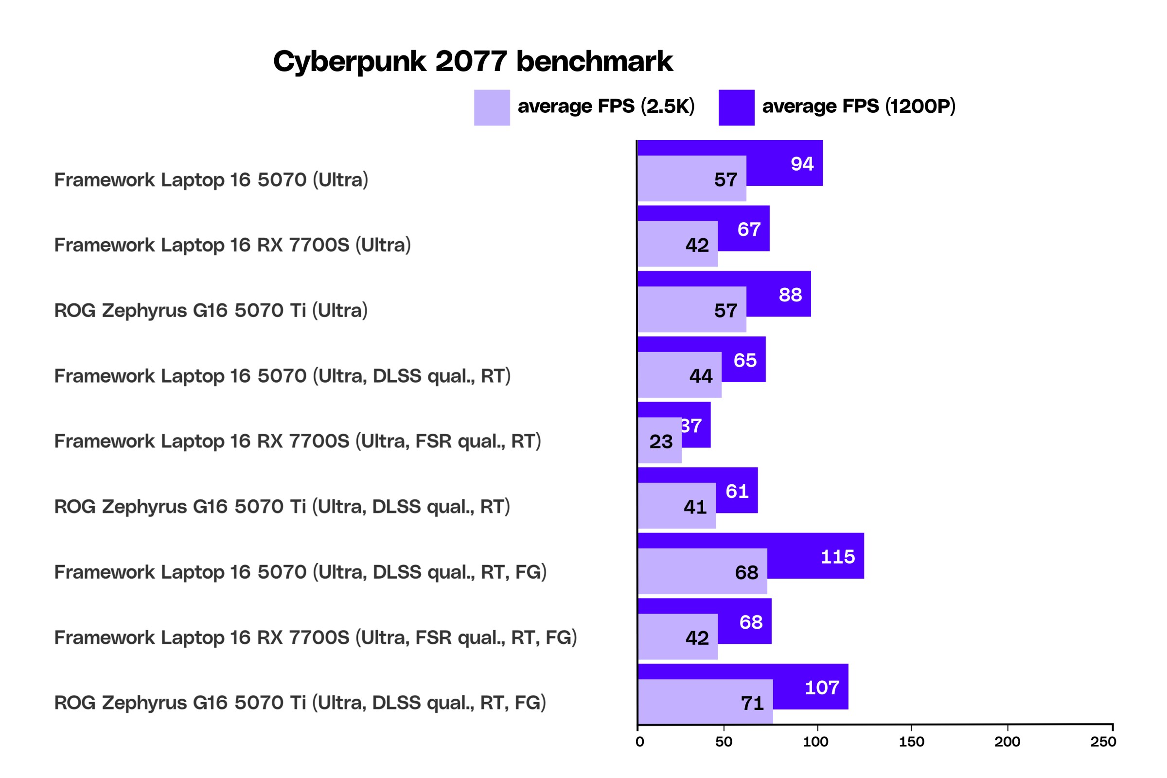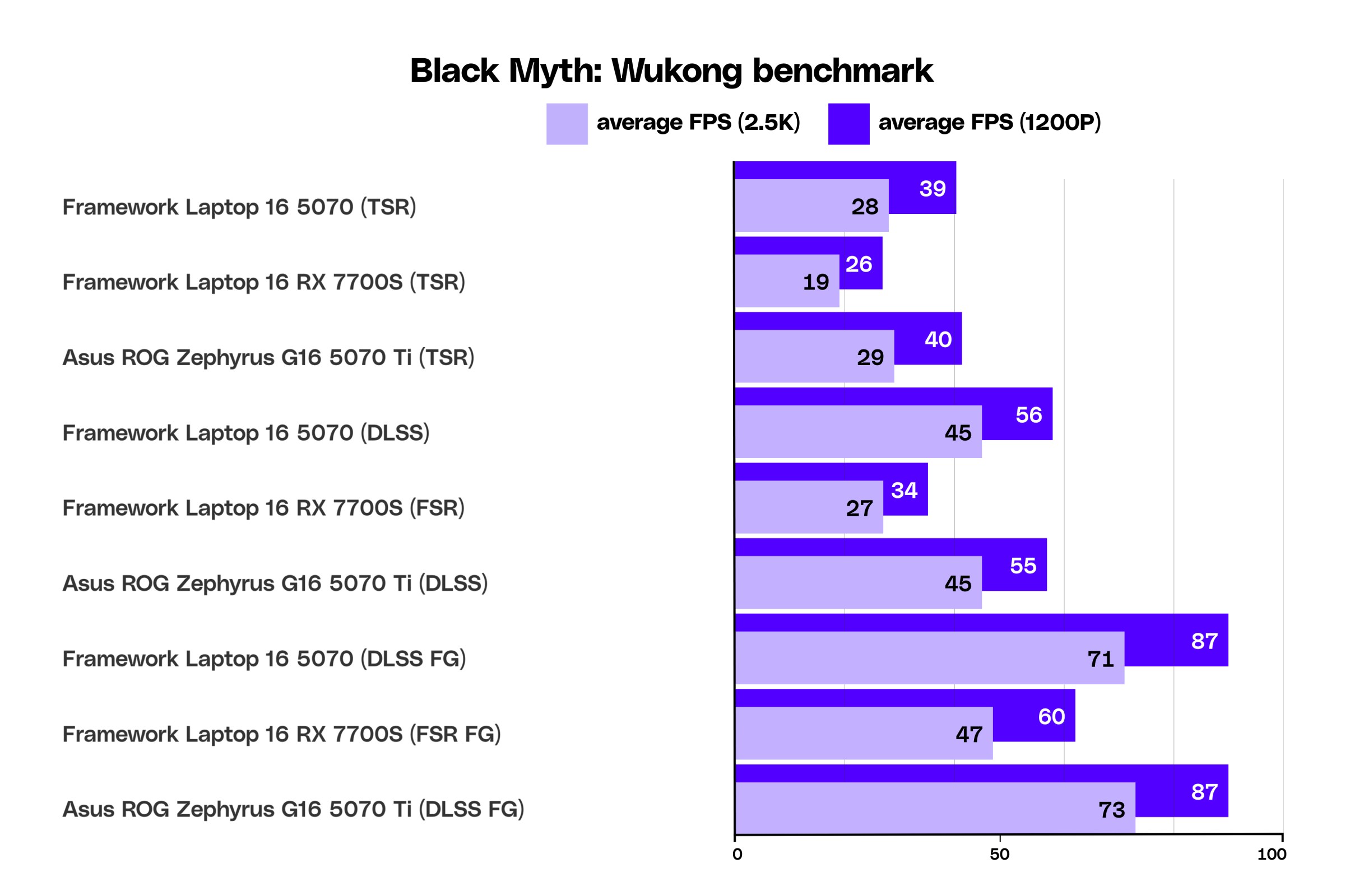 The new graphics card is the bigger update. Graphics-intensive tests like the Geekbench GPU benchmark and 3DMark’s Time Spy show 64 percent and 34 percent improvements, respectively. In fully rasterized gaming benchmarks across Black Myth: Wukong and Cyberpunk 2077, the new Laptop 16 yielded about a 36 to 50 percent increase in average frame rates over the original Radeon RX 7700S module. The delta increases further when using Nvidia’s DLSS 4 rendering on the new model compared to the last-gen with AMD’s FSR 3.1.