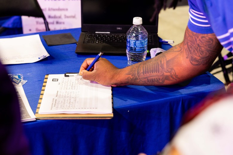 Career fair attendees write down their contact information for potential employers at a hiring event on Thursday. Credit: Amber Esparza / San Antonio Report