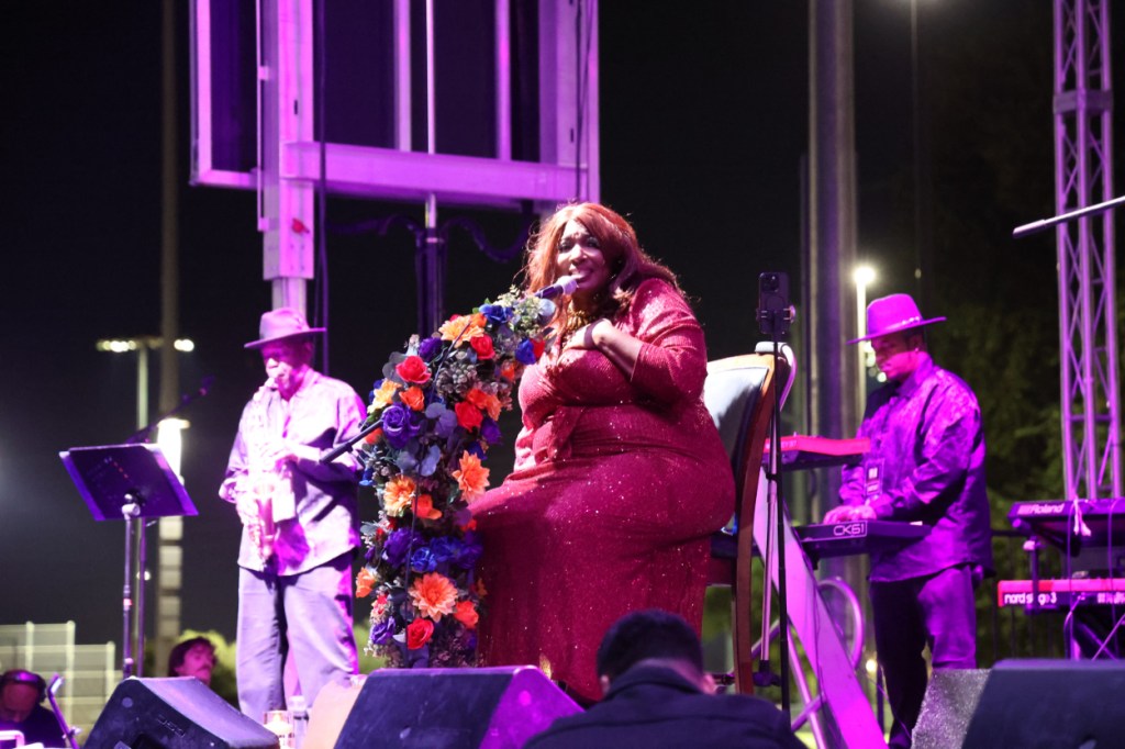Teri Tobin and Friends, as well as her glorious floral microphone, at Tempe Jam in 2025.