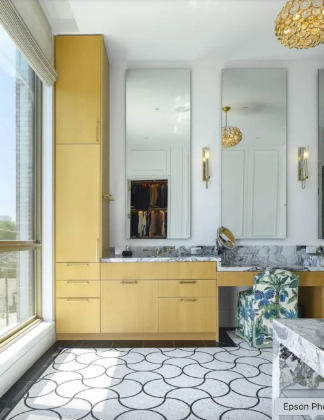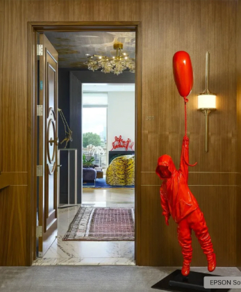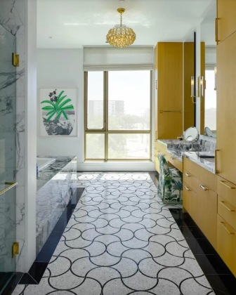 Santini has created whimsical elegance in this three-bedroom, three-and-a-half bath double unit. Although I cannot decide on a favorite space, I might never want to leave the media room. It’s like Aladdin’s cave for the style-obsessed.