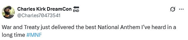 ‘Had to post by “The War and Treaty” doing the National Anthem – #Chills #MNF,’ one fan wrote, reposting a clip of the group’s performance.