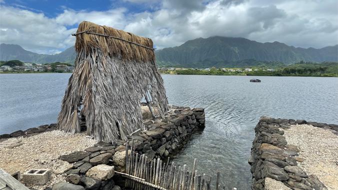 A hale and mākāha at Heʻeia Fishpond. (Photo credit: Annie Innes-Gold)