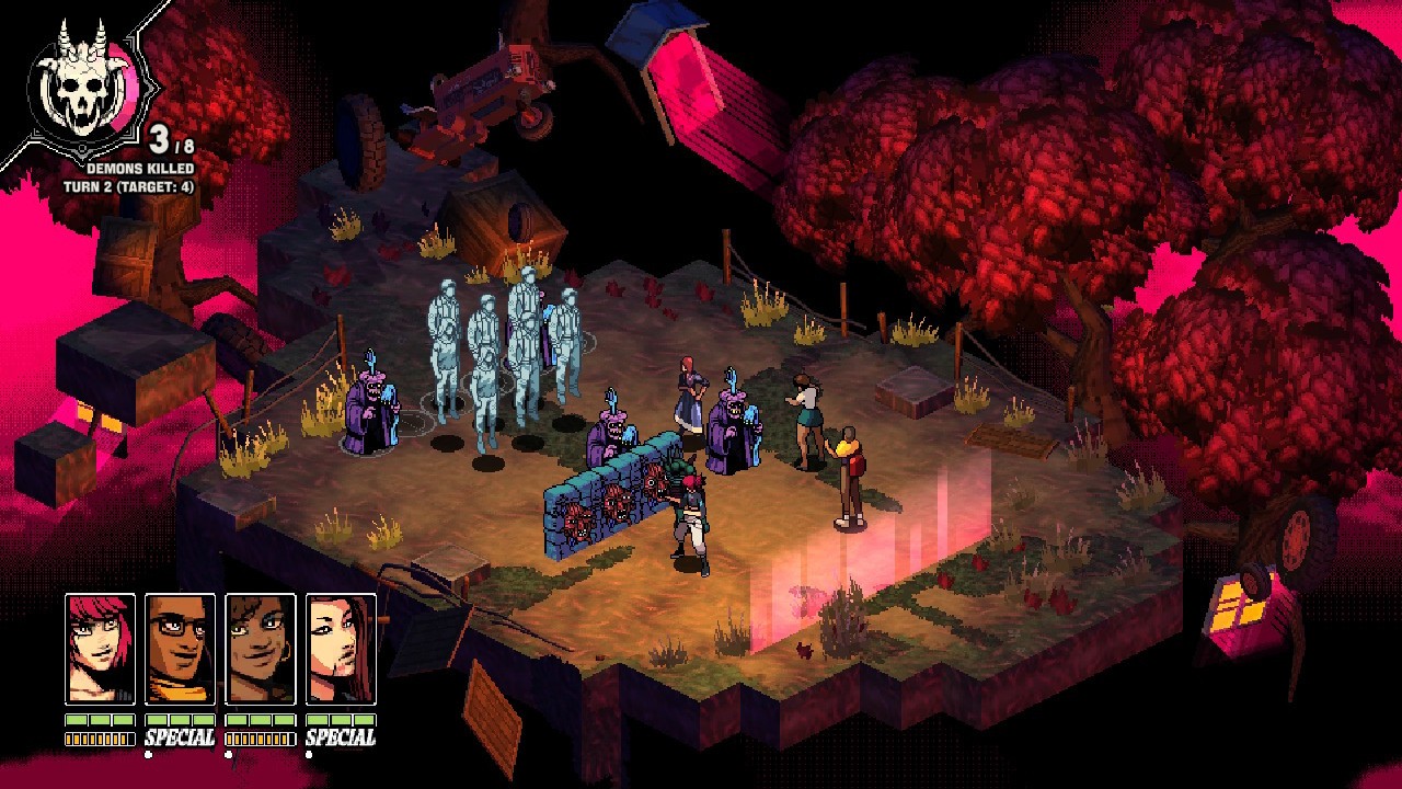 Throughout the planning phase, there’s plenty of room for trial and error. Moves can be rewound and characters can act in any order. Once the movements for the round are locked in, the action phase unfolds, showing all of the piecemeal movements and attacks in full concert with one another. It makes for a satisfying visual, with characters zipping through lines of enemies, activating combos, and sending fountains of blood into the air for each downed combatant. Any remaining enemies then make their moves and attacks before the start of the next round.
