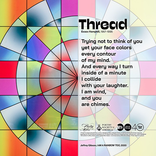 “Thread” by Essex Hemphill from Love is a Dangerous Word: Selected Poems. © 2025 by the Estate of Essex Hemphill. Reprinted by The Permissions Company LLC, on behalf of New Directions Publishing Corp, ndbooks.com. I AM A RAINBOW TOO (2020) © Jeffrey Gibson, NYCT Astoria Blvd Station. Commissioned by MTA Arts & Design.Photo by Etienne Frossard