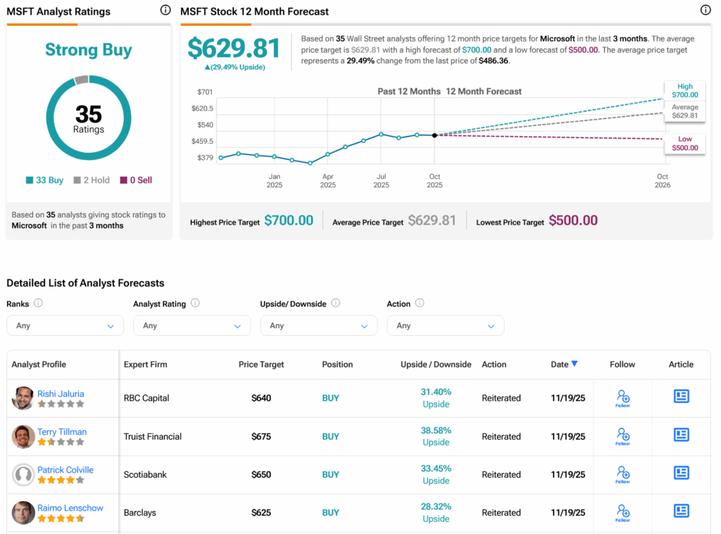 Turning to Wall Street, analysts have a Strong Buy consensus rating on MSFT stock based on 33 Buys and two Holds assigned in the past three months, as indicated by the graphic below. After an 18.85% rally in its share price over the past year, the average MSFT price target of $629.81 per share implies 29.49% upside potential.
