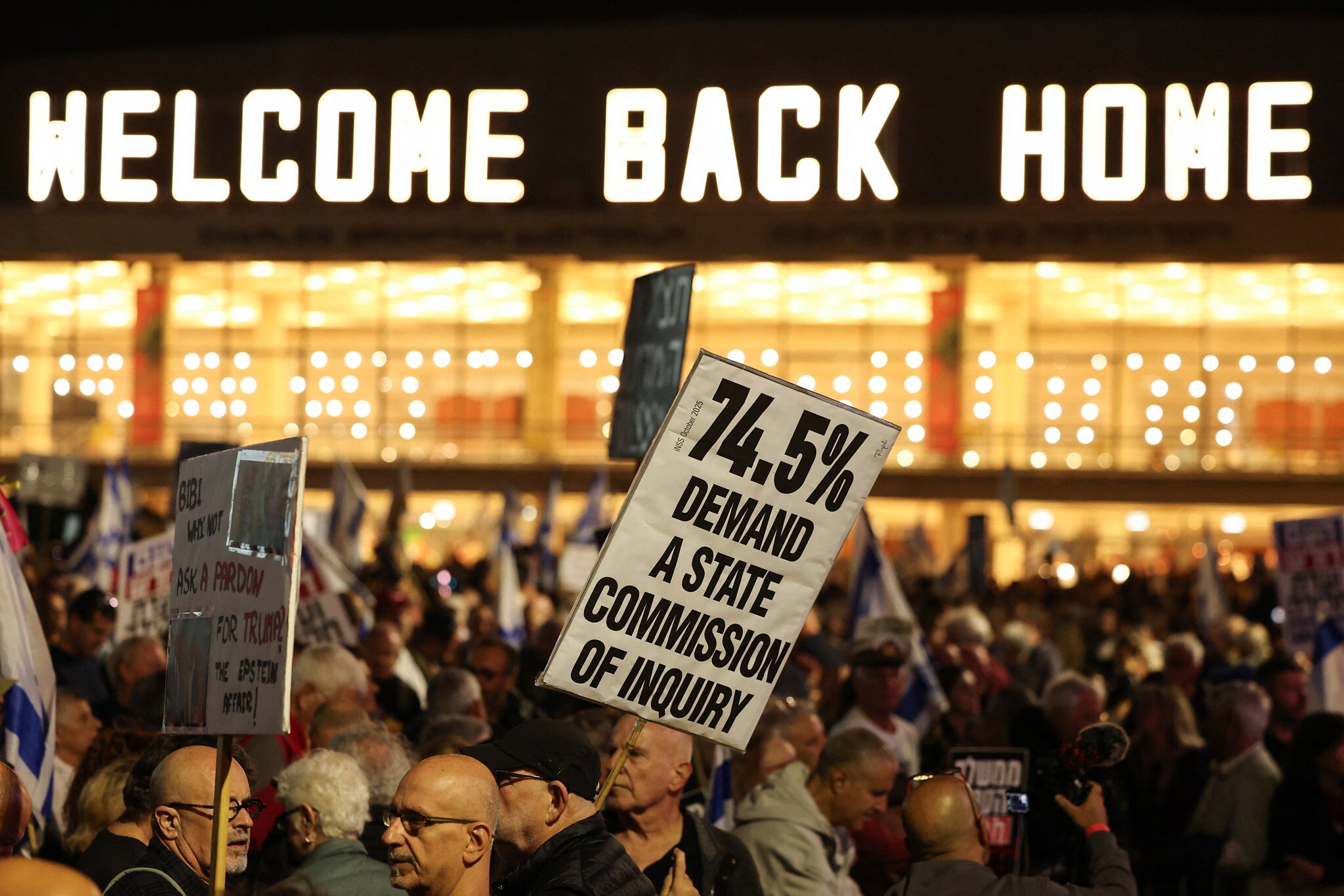Israeli anti-government protesters lift up placards during a demonstration against the prime minister and in support of establishing a state commission of inquiry into Hamas’s October 7, 2023 attacks on Israel, in Tel Aviv on November 15, 2025. (Jack Guez / AFP)